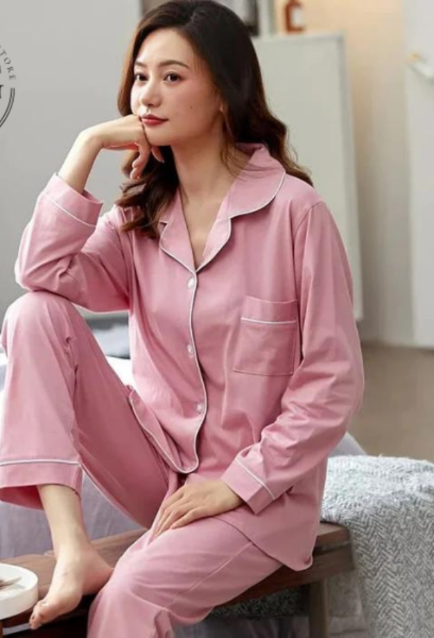 Pink Silk Night Suit Turn Down Collar Long Sleeves